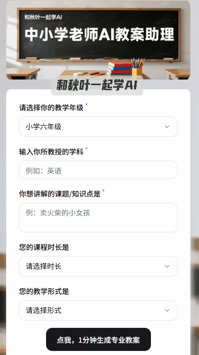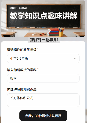 用 AI 给讲授提效,秋叶研发部黑犬教员研发的AI 教案帮理,按照提醒顺次输入:年级、学问点、时长和讲授形式。熬夜肝方案耗到心力交瘁,可简单理解为:用很是规、但高效的体例处理问题。能帮你节流 70% 的时间。